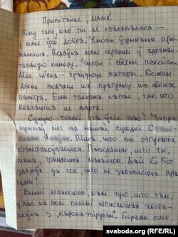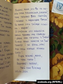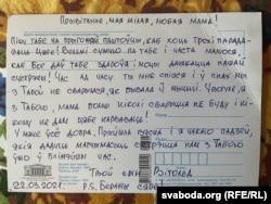Вельмі непакоюся, калі чую, што там, у вас на волі вельмі небясьпечная абстаноўка з „карона-вірусам“. Беражы сябе, мама! Я ведаю, як ты любіш пахадзіць па Бярозаўцы! Але, прашу цябе, сьцеражыся! Хоць маску насі. Упэўнены, што ты так і зробіш.