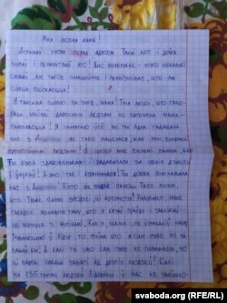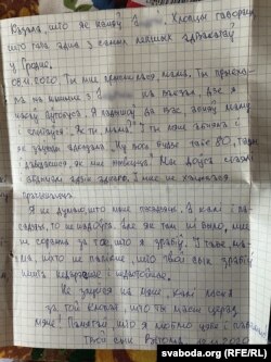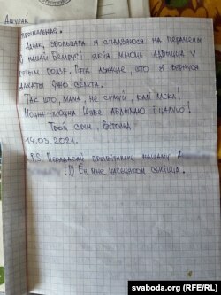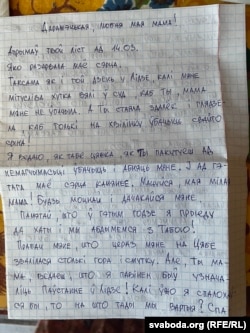 Я ведаю, як табе цяжка, як ты пакутуеш ад немагчымасьці ўбачыць і абняць мяне. І ад гэтага маё сэрца камянее. Мацуйся, мая мілая мама! Будзь моцнай і дачакайся мяне.