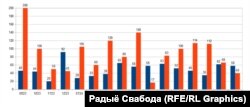 - Дадзеныя абедзьвюх крыніц фіксуюць аднолькавыя тэндэнцыі, датычныя зьмены колькасьці палітзьняволеных.