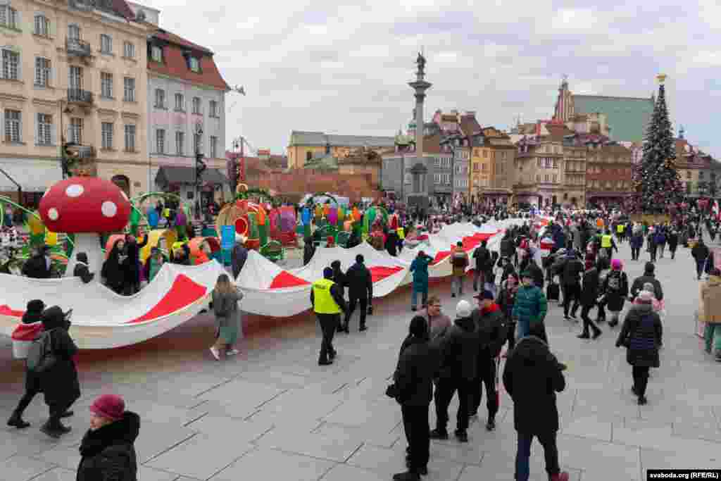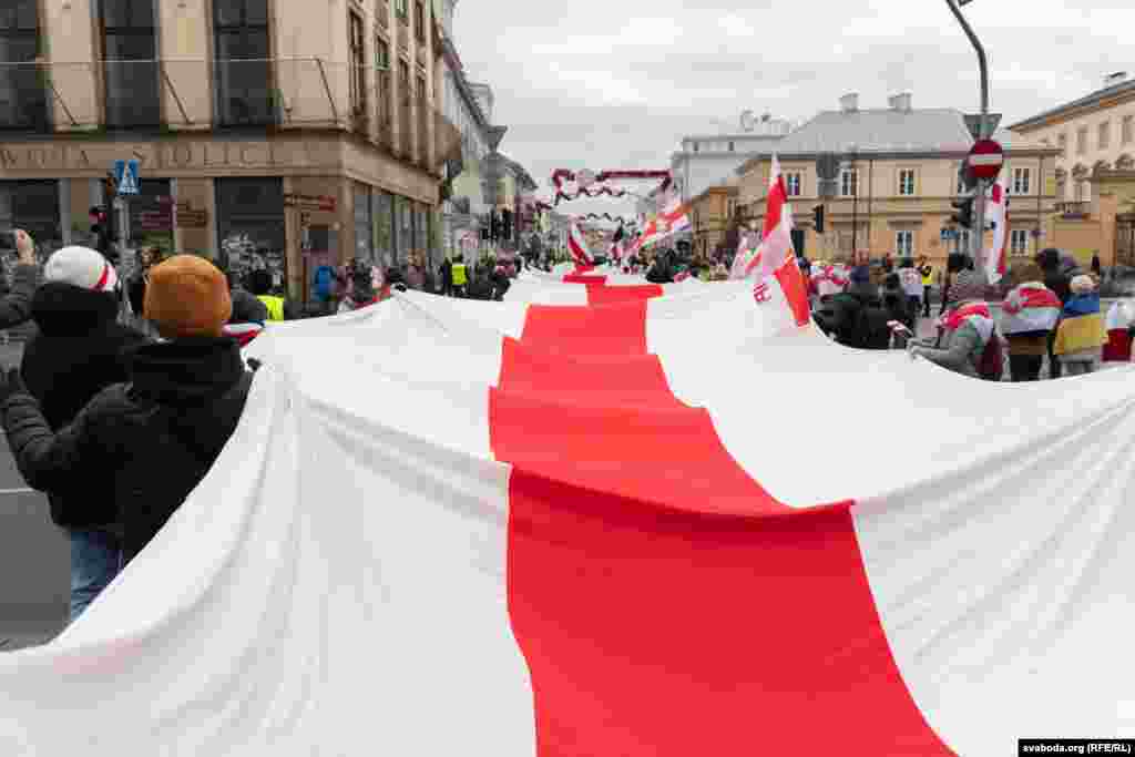 Беларусы разгарнулі вялікі бел-чырвона-белы сьцяг на маршы ў Варшаве даўжынёй ў 250 мэтраў