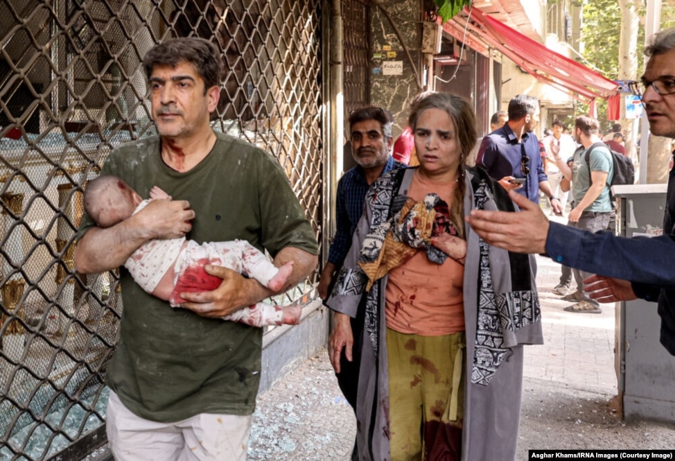 Мужчына нясе параненую дзяўчынку пасьля выбуху ў цэнтры Тэгерану 15 чэрвеня 2025 падчас ізраільскіх удараў па цэлях ува ўсім Іране.
