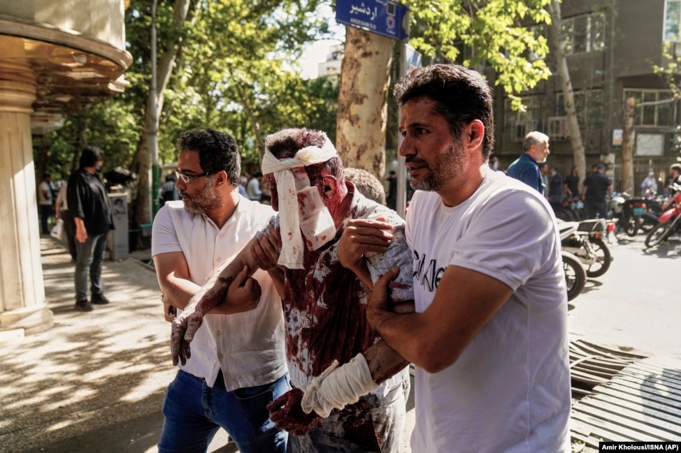 Людзі дапамагаюць параненаму мужчыну пасьля ізраільскага ўдару па цэнтры Тэгерану, 15 чэрвеня 2025 году.