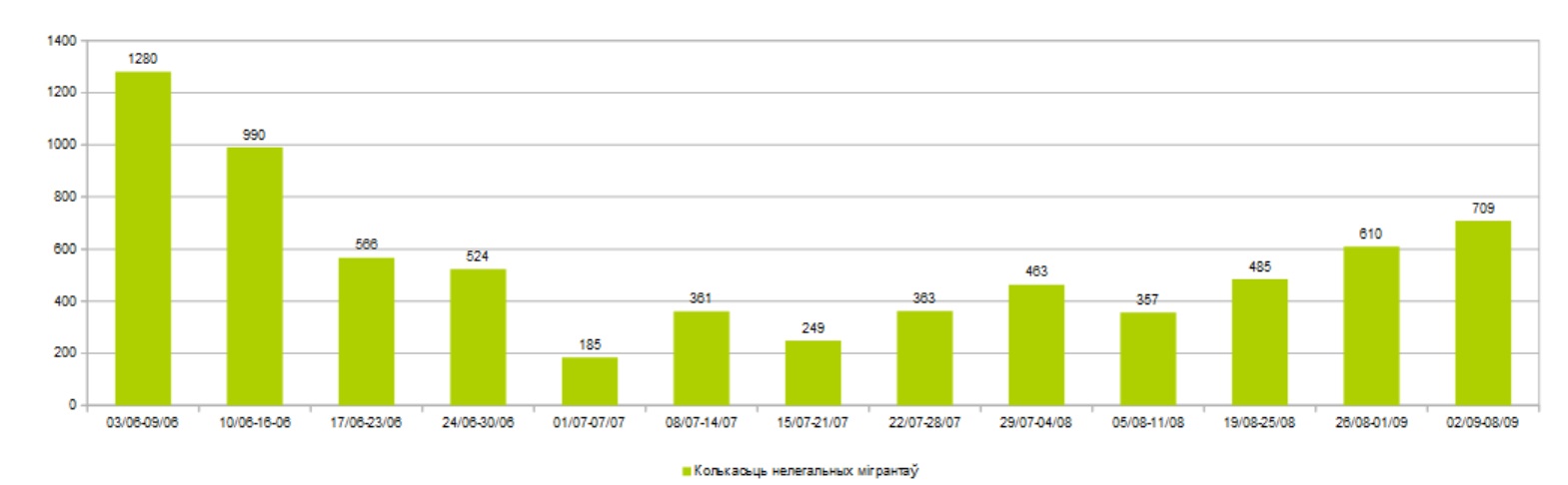 Уяўленьне пра тое, што адбываецца на мяжы, дае графік дасьледчыка Цэнтру новых ідэяў Генадзя Коршунава, створаны на падставе памежнай статыстыкі эўрапейскіх суседзяў Беларусі. Ён паказвае штотыднёвую дынаміку колькасьці нелегальных мігрантаў, якія спрабавалі патрапіць у Польшчу праз мяжу зь Беларусьсю ў чэрвені — верасьні сёлета.