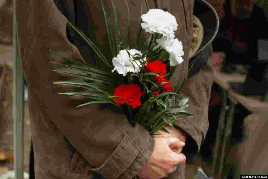 Пасьля разьвітаньня з прахам Караль Наўроўцкі перадаў сьцяг з труны 81-гадоваму сыну Сяргея Пясэцкага Ўладыславу Тамашэвічу (на фота першы справа)