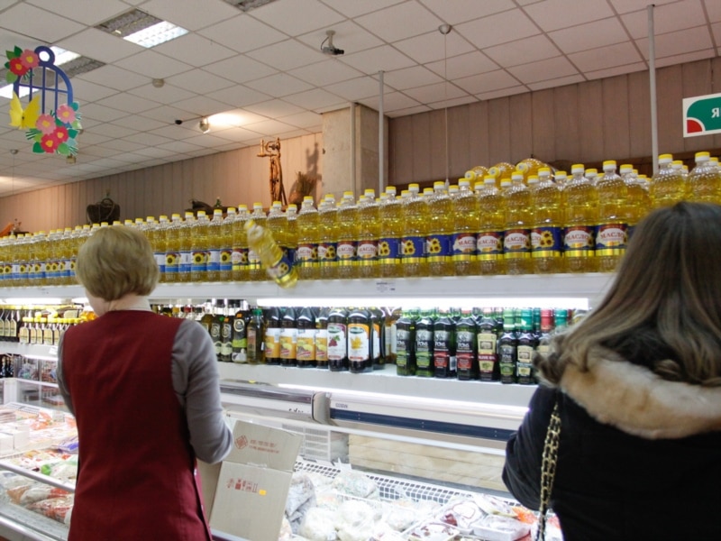 Паліцы з алеем у Віцебску не пустыя. Зьявіўся, да прыкладу, кукурузны алей амаль па 8 тысяч рублёў, ці рапсавы — па 6 тысяч. Сланечнікавы алей каштуе ў сярэднім пад 7 тысяч, таму спадарыня Людміла лічыць, што ёй пашанцавала: