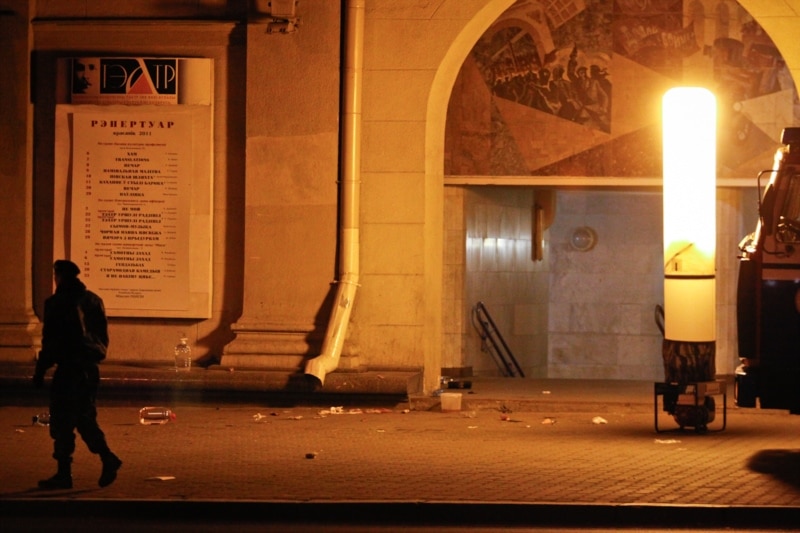 Увечары 11 красавіка людзі прыйшлі на Кастрычніцкую плошчу ў Менску, каб паставіць сьвечкі і ўскласьці кветкі, ушаноўваючы ахвяраў выбуху на станцыі мэтро, які адбыўся некалькімі гадзінамі раней.