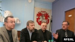 Удзельнікі прэсавай канфэрэнцыі: Міхаіл Марыніч, Андрэй Саньнікаў, Мікалай Статкевіч і Віктар Івашкевіч
