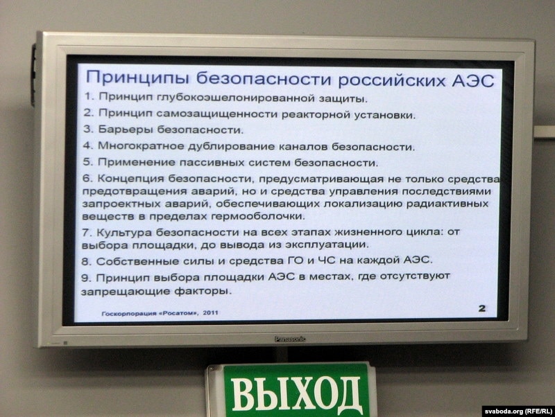 У беларускім грамадзтве пасьля Чарнобылю застаецца недавер да атамнай энэргетыкі. Прадстаўнікі расейскіх карпарацый з гэтай нагоды зазначаюць, што іх атамныя тэхналёгіі перадавыя, а прынцыпы і сыстэмы бясьпекі АЭС — найлепшыя ў сьвеце. Дырэктар праграм дзяржкарпарацыі «Росатом» Сяргей Баяркін:
