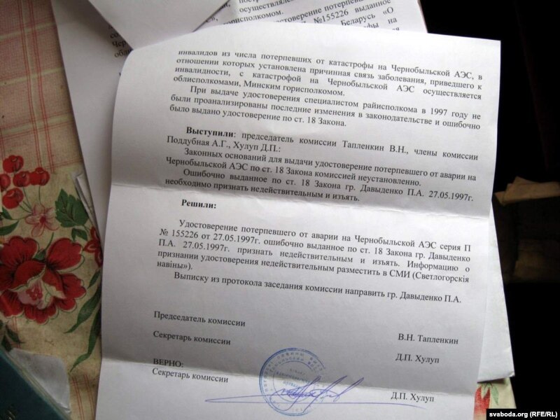 Летась у сьнежні камісія Сьветлагорскага райвыканкаму пастанавіла пазбавіць Павэла Давыдзенку пасьведчаньня пацярпелага ад аварыі на Чарнобыльскай АЭС. Палічылі, што выдадзена яно памылкова, без уліку зьменаў у чарнобыльскім заканадаўстве. Праўда, інвалідзкае пасьведчаньне пакінулі.