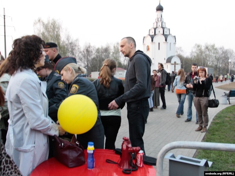 18:10 Пляцоўка, дзе дазволены мітынг да сумных угодкаў чарнобыльскай катастрофы, адгароджаная турнікетам. На ўваходзе стаяць спэцназаўцы, яны правяраюць ў людзей рэчы. Некаторых актывістаў апазыцыі запісваюць ў адмысловыя сьпісы. Гэтаксама кожны, хто заходзіць на мітынговую пляцоўку, здымаецца на відэа.