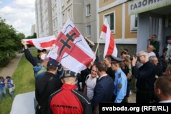 «Не саюзу з бандай», «Пуцін — забойца», «Расея гэта вайна», — такія лёзунгі былі на плякатах пікетоўцаў і прагучалі каля дому нумар 32 на Магілёўскай вуліцы.