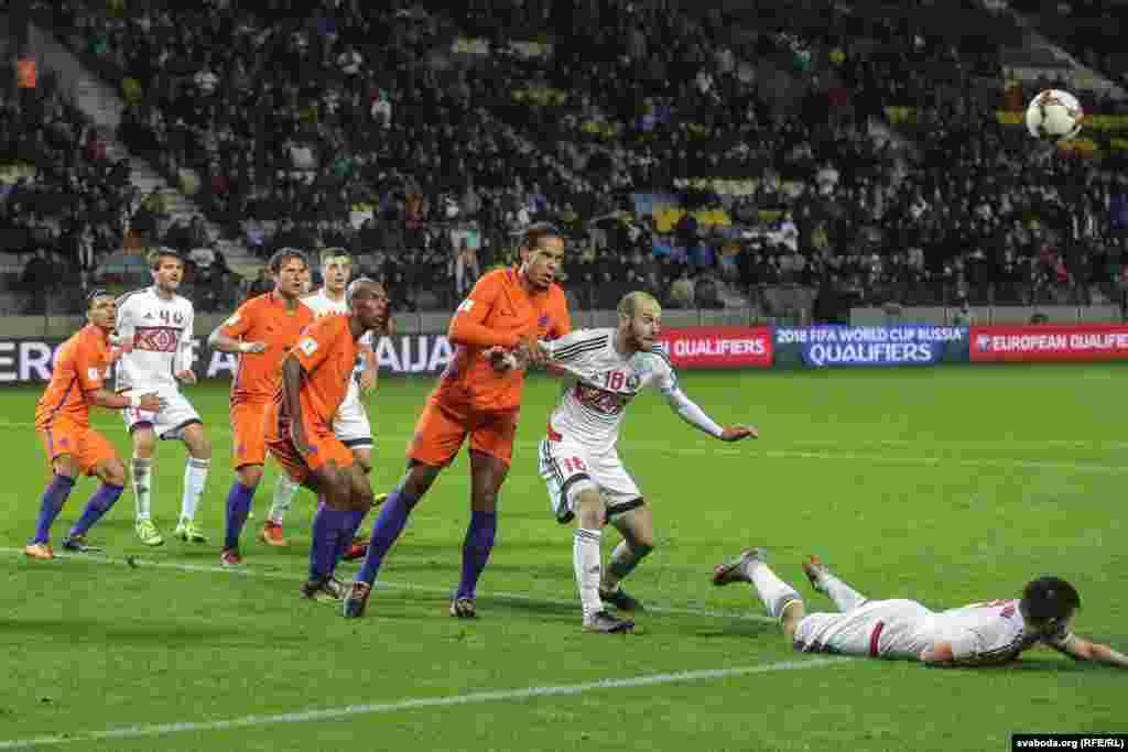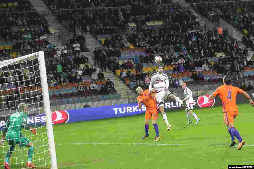 Ды на 83-й хвіліне пэнальці ў вароты Чэрніка забіў Ар’ен Рабэн. Але беларусы спрабавалі адыграцца і наносіла ўдар за ўдарам па варотах Нідэрляндаў. Ужо перад самым канцом гульні беларусам са штрафнога забіў Мэмфіс Дэпай.