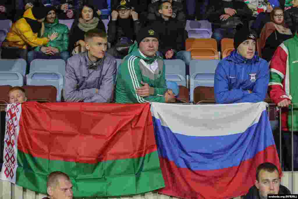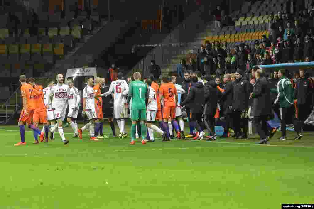 Першы тайм зборная Беларусі прайграла 0:1 — Даві Пропэр (на фота зьлева) забіў на 24-й хвіліне. Але на 55-й хвіліне Максім Валадзько (на фота ў цэнтры) зраўняў лік.