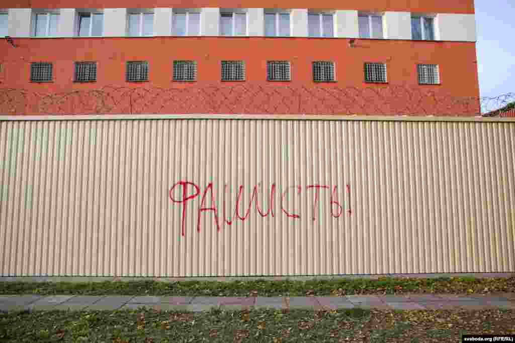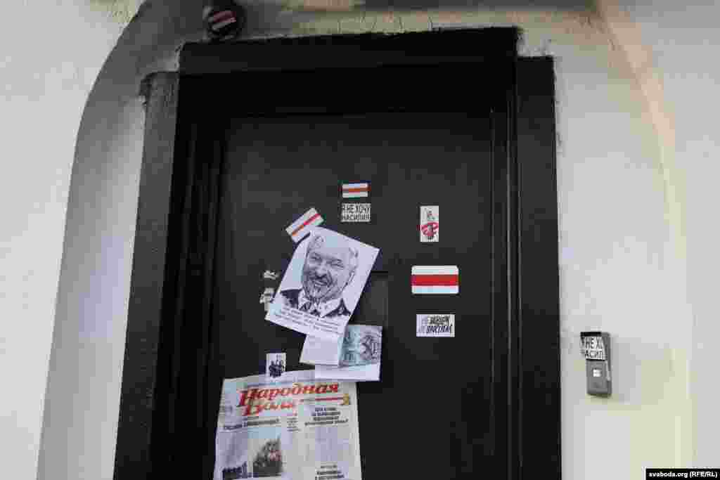 Пратэстоўцы лепяць плякаты на дзьверы ізалятара на Акрэсьціна