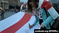 Да ўдзельнікаў акцыі падыходзілі мінакі, віталі іх лёзунгам «Жыве Беларусь!» і пакідалі на сьцягу свае пажаданьні беларусам.