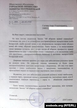 «Гарадзкое таварыства абароны правоў спажыўцоў», напрыклад, адзначае: «На наш погляд, недахопам закону «Аб абароне правоў спажыўцоў» ёсьць тое, што ў ім прапісаная альтэрнатыўнасьць выкарыстаньня альбо беларускай, альбо расейскай мовы, а не абавязковасьць выкарыстаньня абедзьвюх моваў. Такім чынам, у ім выпусташаная самая прававая сутнасьць, дух і літара закону аб абароне правоў грамадзяніна на адну зь дзяржаўных моваў. Відавочна, што для забесьпячэньня рэальнай роўнасьці моваў неабходнае, у першую чаргу, прыняцьцё зьменаў у заканадаўстве».
