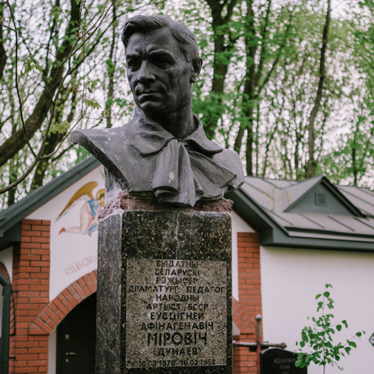 Пасьля загадкавай сьмерці Купалы ў Маскве ў 1942 годзе ягоны прах быў пахаваны на тамтэйшых Ваганькаўскіх могілках. І толькі ў 1962 годзе урну з прахам перапахавалі ў Менску — побач з магілай Якуба Коласа. Архітэктарам абодвух надмагільляў быў Міхаіл Мызьнікаў.