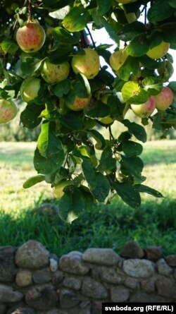 «А як пахне дасьпелы восеньскі сад! <...> Раніца. Кісла-салодкая яблыня. Пяць сукоў з аднаго кораня. Яблыкі невялікія, але якая смаката! Белыя, з чырвонымі рыскамі. Тыя, каторыя высьпелі ўжо, — жоўтыя і сьвецяцца на сонцы, як бурштын. <...> Яблыкі ўраселі — такая шчодрая была ўночы раса. <...> Штрыфэль таксама ў расе».
