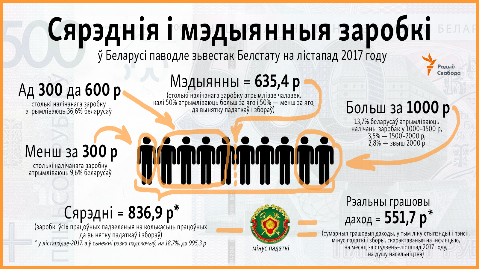 Паводле справаздачы аб сацыяльна-эканамічных паказьніках Беларусі за 2017 год, які апублікаваў «Белстат», мэдыянны заробак у Беларусі за лістапад 2017 году склаў 635,4 рубля.