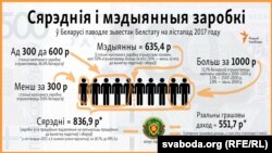 Афіцыйныя лічбы мэдыянных заробкаў публікуюцца нячаста (і ў дакладзе на іх не акцэнтуецца ўвага), але яны заўсёды адчувальна меншыя за лічбы сярэдніх заробкаў. Так, за лістапад 2017 году мэдыянныя заробкі былі на 200 рублёў меншымі за сярэднія — 836,9 рубля (у сьнежні сярэдні заробак «накруцілі» да амаль 1000 рублёў).