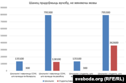 Вернемся да адукацыі. Параўнайма шанцы беларускамоўных і расейскамоўных прадоўжыць навучаньне на сваёй мове — у сярэдняй спэцыяльнай або ў вышэйшай вучэльні. У 2014/15 навучальным годзе ў нас было 135100 школьнікаў, якія вучыліся па-беларуску. Іх чакала 300 месцаў і ў коледжах, і ва ўнівэрсытэтах (вядома, паступаюць найперш сёлетнія выпускнікі, але мы супастаўляем агульныя лічбы). Адпаведна па-расейску вучылася 795300 школьнікаў. На іх разьлічана 128100 навучэнцкіх месцаў у ССНУ і 362600 — у вышэйшых школах.