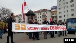 Удзельнікаў ужо больш за сотню. Апроч бел-чырвона-белых сьцягоў, ёсьць сьцягі Эўразьвязу, Украіны і прафсаюзу РЭП. Сярод расьцяжак – «Беларусь – у Эўропу», «Мы – эўрапейцы», «Крым – Украіне, шчасьце – краіне». Удзельнікі скандуюць «Жыве Беларусь».