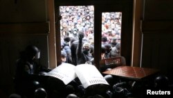 Пасьля міліцыянты, якія ахоўваюць адміністрацыю звонку, зьнялі шапкі разам зь людзьмі, калі тыя ўшаноўвалі хвілінай маўчаньня памяць загінулых пратэстоўцаў.