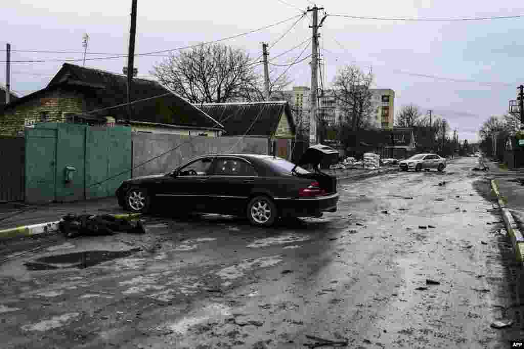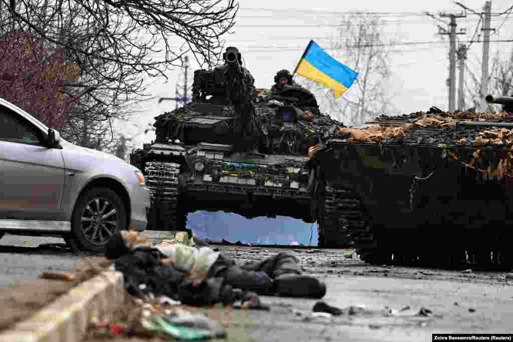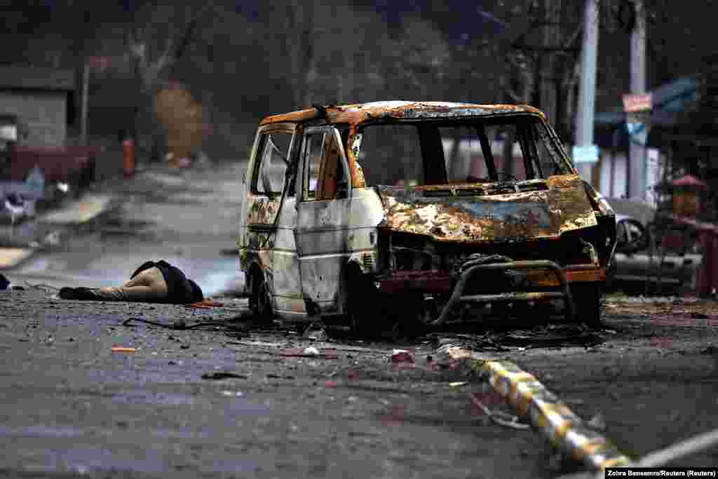 Вуліцы Бучы заваленыя целамі мірных жыхароў пасьля расейскай акупацыі — фотасьведчаньне