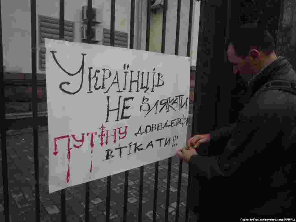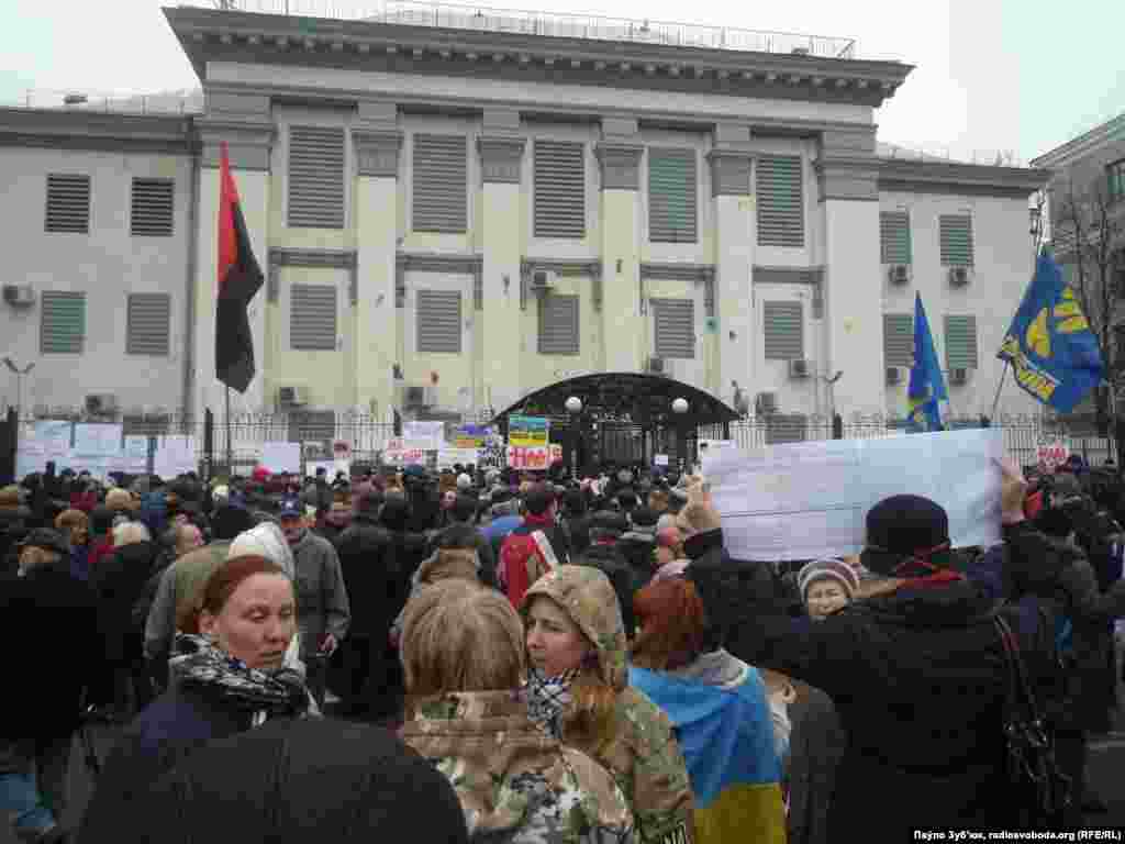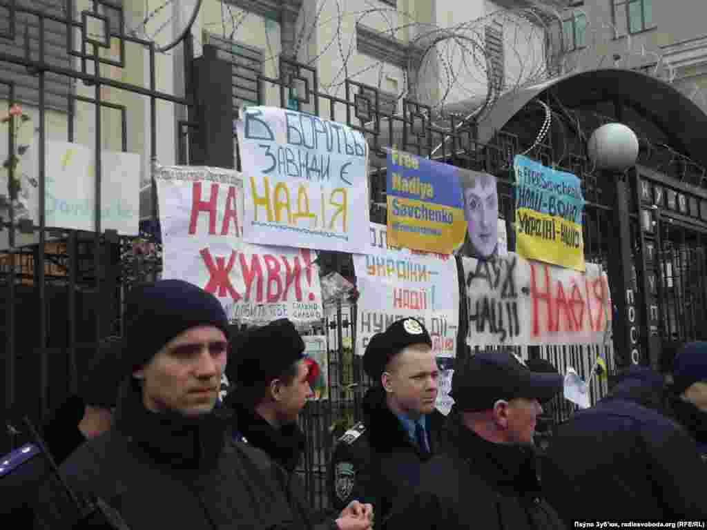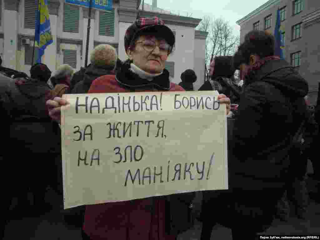 Падчас выступу прамоўцаў гучалі заклікі ўвесьці забарону на гандаль і разарваць дыпляматычныя адносіны з Расейскай Фэдэрацыяй, а таксама абвінавачваньні ў бок сёньняшняй украінскай улады, якая, на думку некаторых, робіць надта мала для выратаваньня Надзеі. Таксама ў бок будынку амбасады, якую ахоўвалі каля сотні паліцыянтаў, паляцела некалькі яек і бутэлькі зь ёдам.