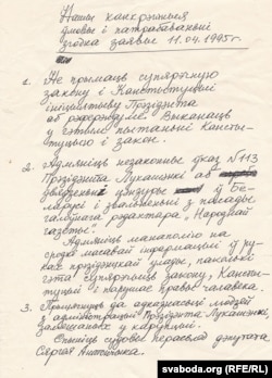 3. Прыцягнуць да адказнасьці людзей з адміністрацыі Прэзыдэнта Лукашэнкі, замяшаных у карупцыі. Спыніць судовы перасьлед дэпутата Сяргея Антончыка ( за даклад аб карупцыі ў камандзе Лукашэнкі — С. Н.)».