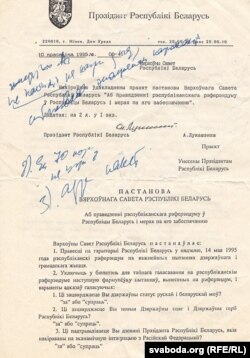 Мы ў сваіх выступах зьвярталі ўвагу на тое, што паводле артыкулу 78 тагачаснай Канстытуцыі, рэфэрэндум павінен быў праводзіцца ў адпаведнасьці з законам. Праўныя аспэкты рэфэрэндуму рэгуляваліся Законам «Аб усенародным галасаваньні (рэфэрэндуме)». І вось паводле гэтага закону, на рэфэрэндум не маглі выносіцца пытаньні нацыянальна-гістарычнай адметнасьці (пры гэтым распрацоўнікі закону кіраваліся тым, што мова, гістарычныя і нацыянальныя каштоўнасьці не належаць сучаснаму пакаленьню, і яно, гэтае пакаленьне, ня мае права пазбаўляць іх пакаленьні будучыя, і наагул вырашаць і за продкаў, і за нашчадкаў). Менавіта такімі пытаньнямі зьяўляліся два пытаньні з чатырох, прапанаваных А. Лукашэнкам: аб статусе беларускай мовы і аб дзяржаўных сымбалях.