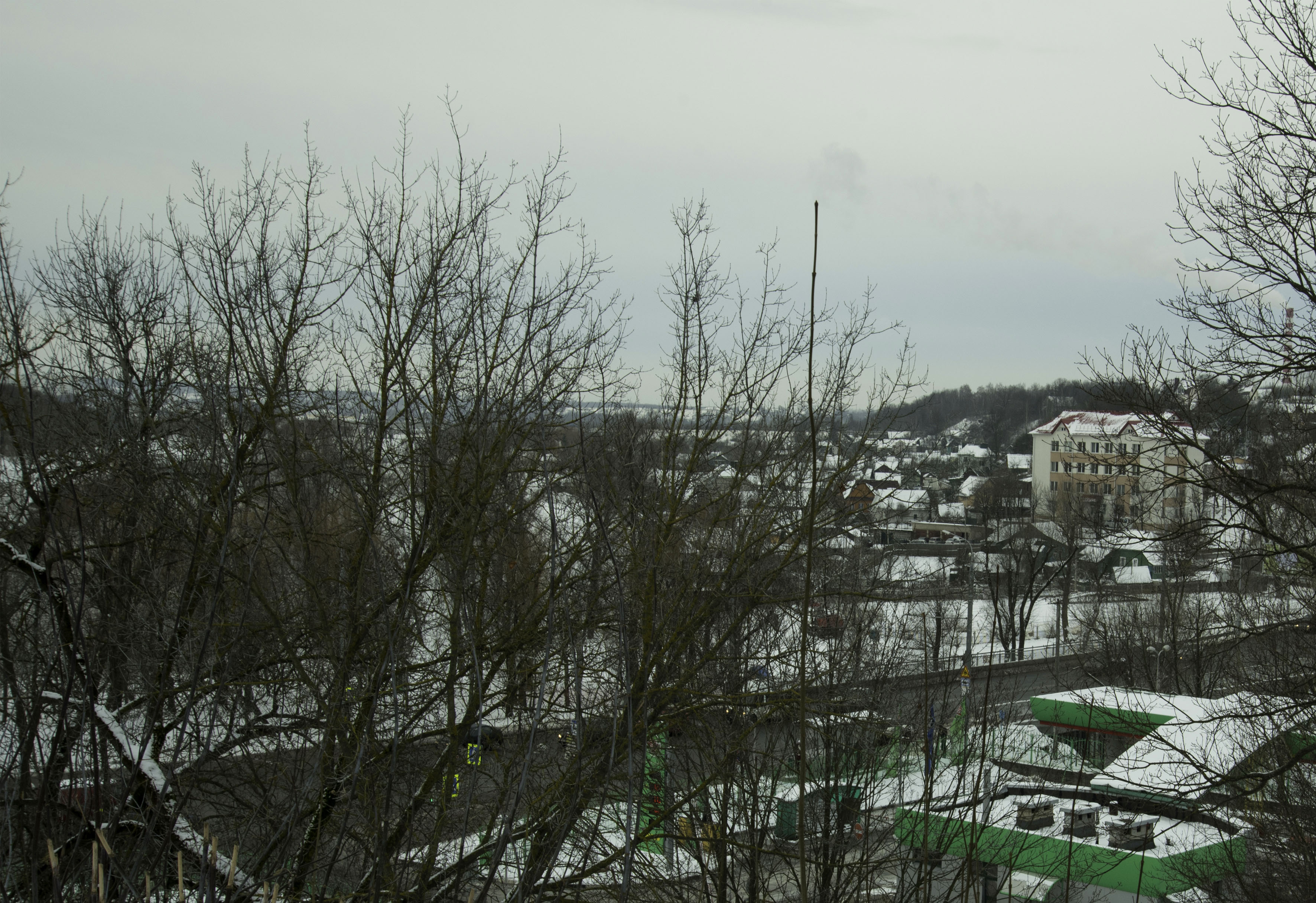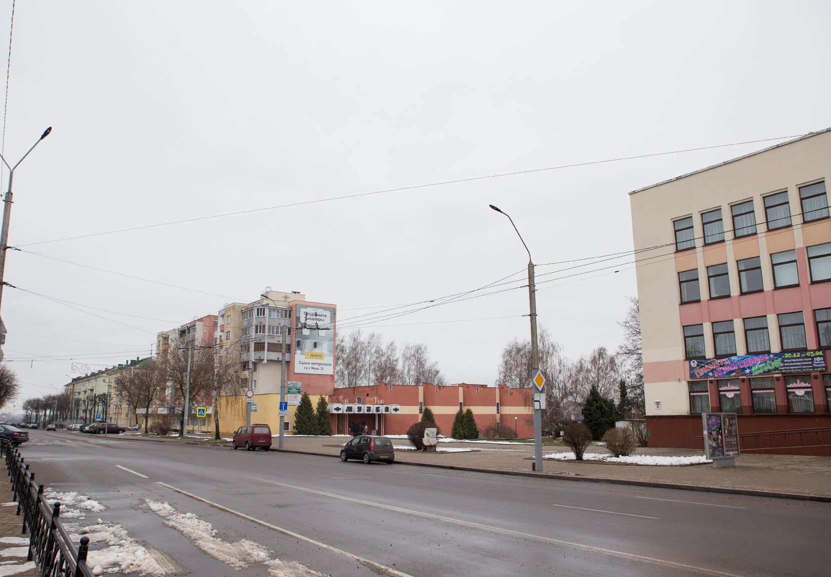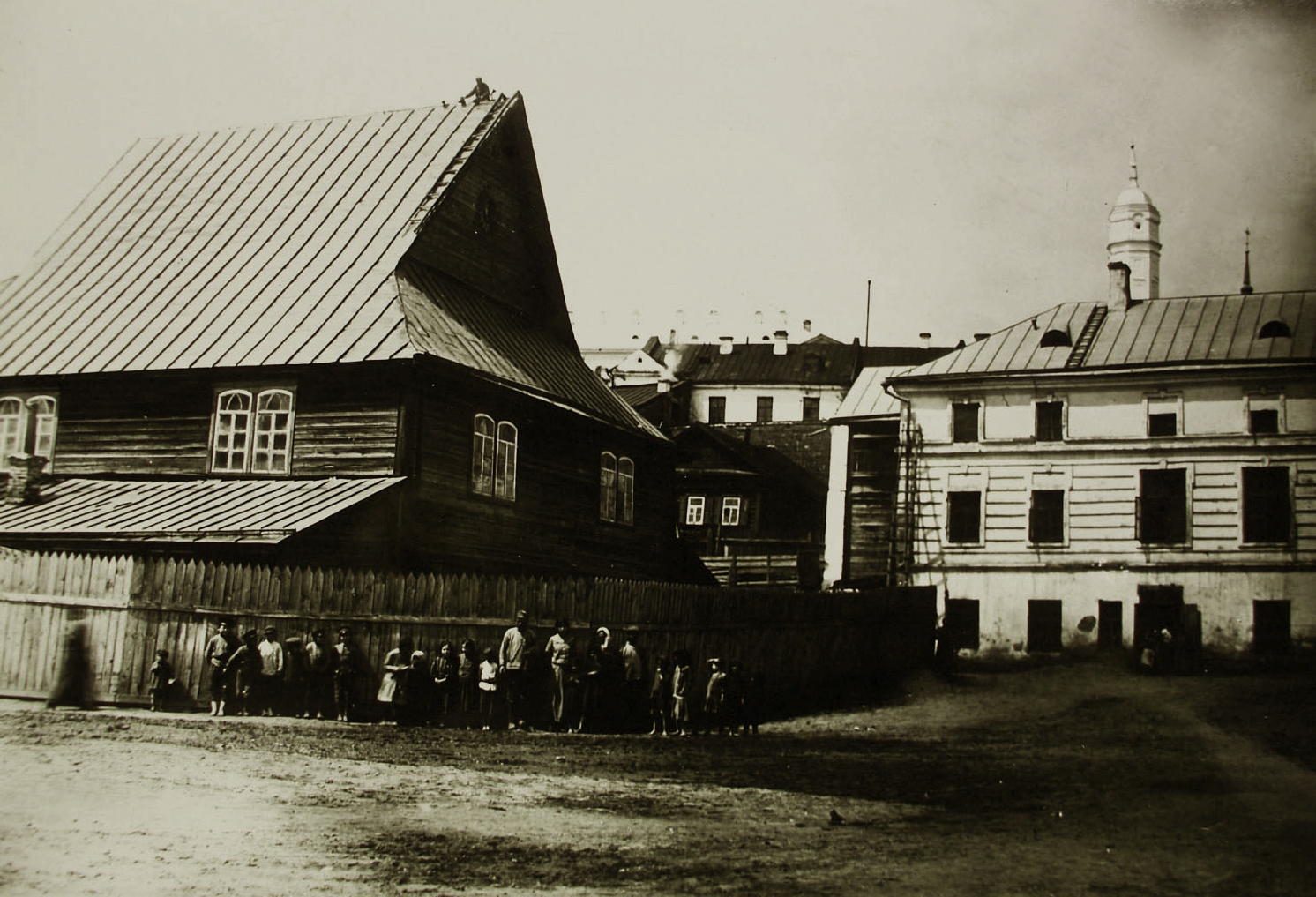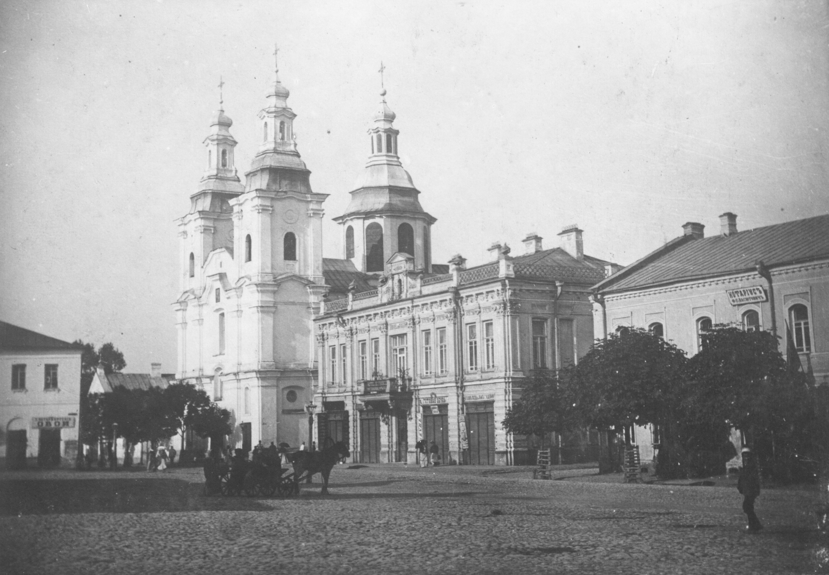 Справа на фота відаць купал Пакроўскай царквы. Праваслаўную сьвятыню разбурылі паміж 1952 і 1956 гадамі. Цяпер яе аднаўляюць