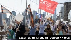 «Падчас праходу па Бруклінскім мосьце мы ўшыхтаваліся ў калёну расейскіх актывістаў і тлумачылі амэрыканцам, што пад гэтымі сымбалямі, так званымі „каларадзкімі“ стужкамі, у гэтыя самыя дні расейскія найміты забіваюць грамадзянаў Украіны на Данбасе. Пасьля гэтага людзі іх проста выкідалі ў рэчку», — кажа Юрась.