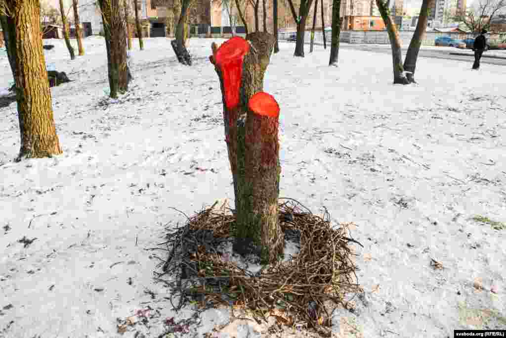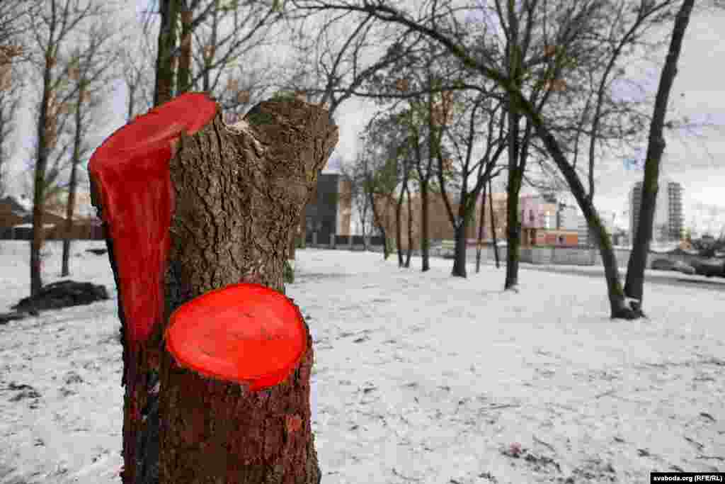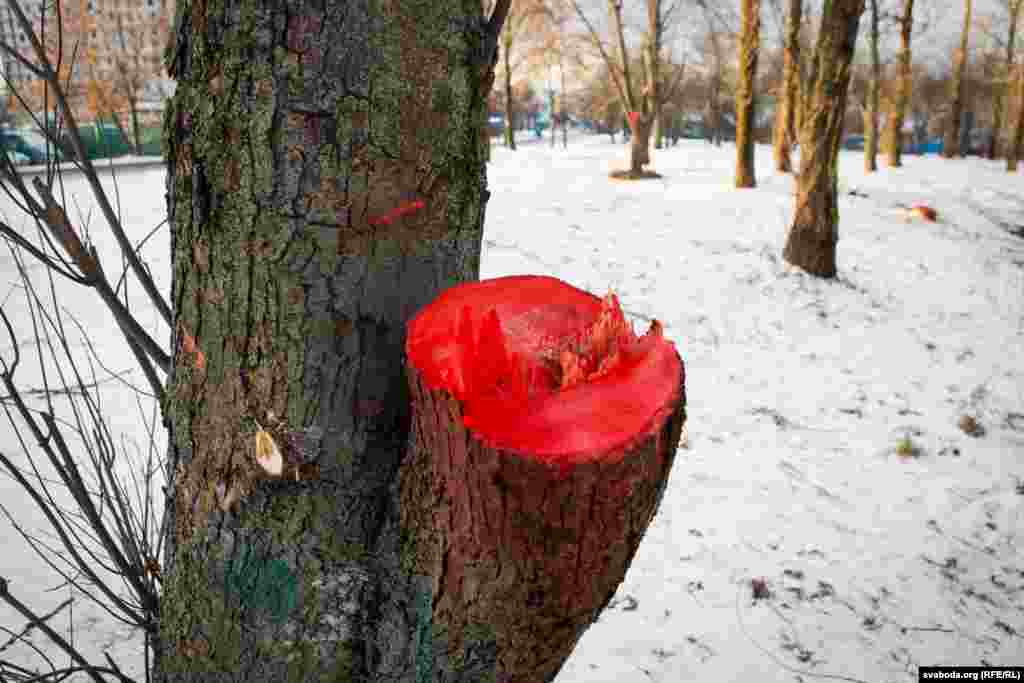 Супрацоўнікі камунальнага прадпрыемства «Зелянбуд Савецкага раёну г. Менску» пачалі пілаваць дрэвы 6 сьнежня раніцай, але пад ціскам жыхароў раёну і актывістаў экалягічнага таварыства «Зялёная сетка» спыніліся.