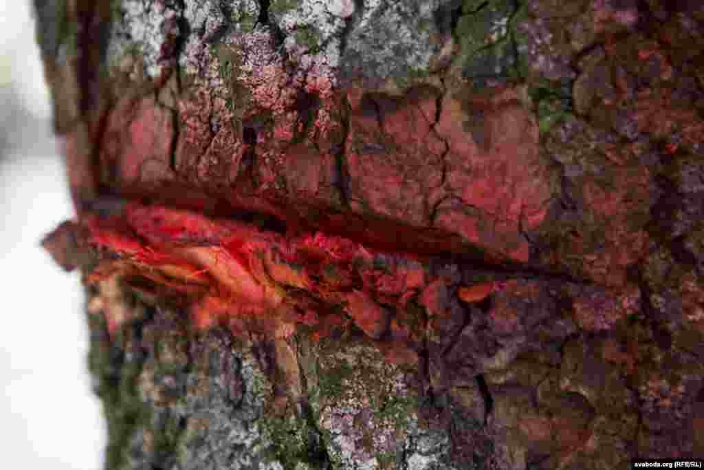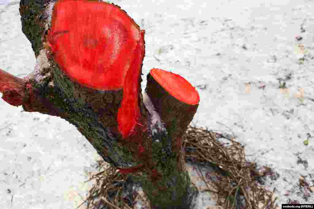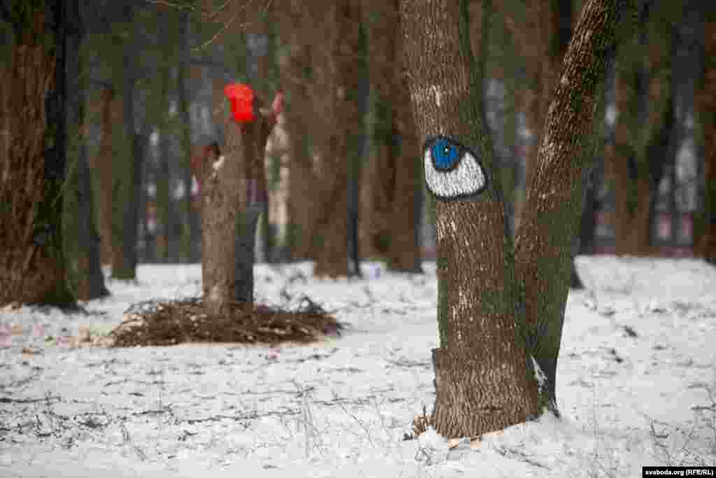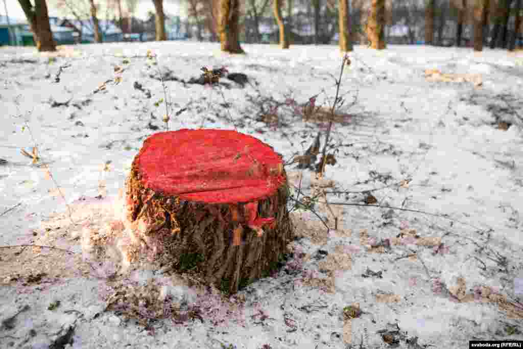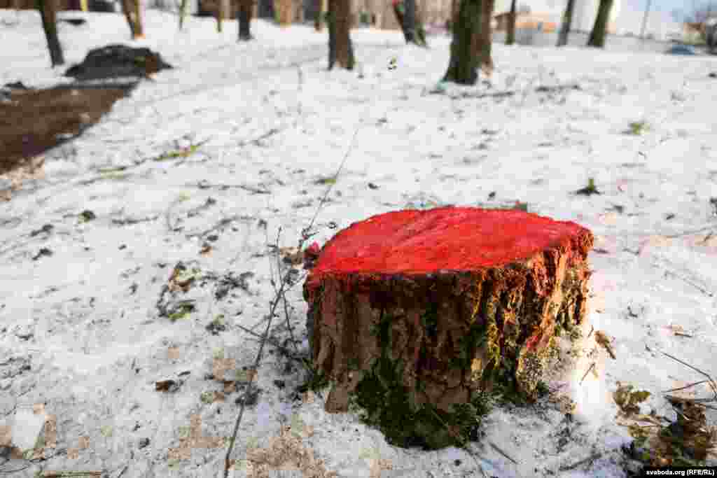 Рэшткі сьпілаваных дрэваў актывісты размалявалі чырвонай фарбай, якая сымбалізуе кроў. На дрэвах уздоўж вуліцы зьявіліся вочы — сымбаль таго, што грамадзтва заклапочанае тым, што гэтыя дрэвы могуць зьнішчыць.