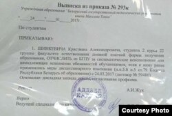 У выпісцы з загаду напісана, што адлічылі яго за «сыстэматычнае невыкананьне абавязкаў навучэнца». Загад датаваны 24 сакавіка — мінулай пятніцай. Але дэканат паведаміў пра адлічэньне толькі 28 сакавіка.