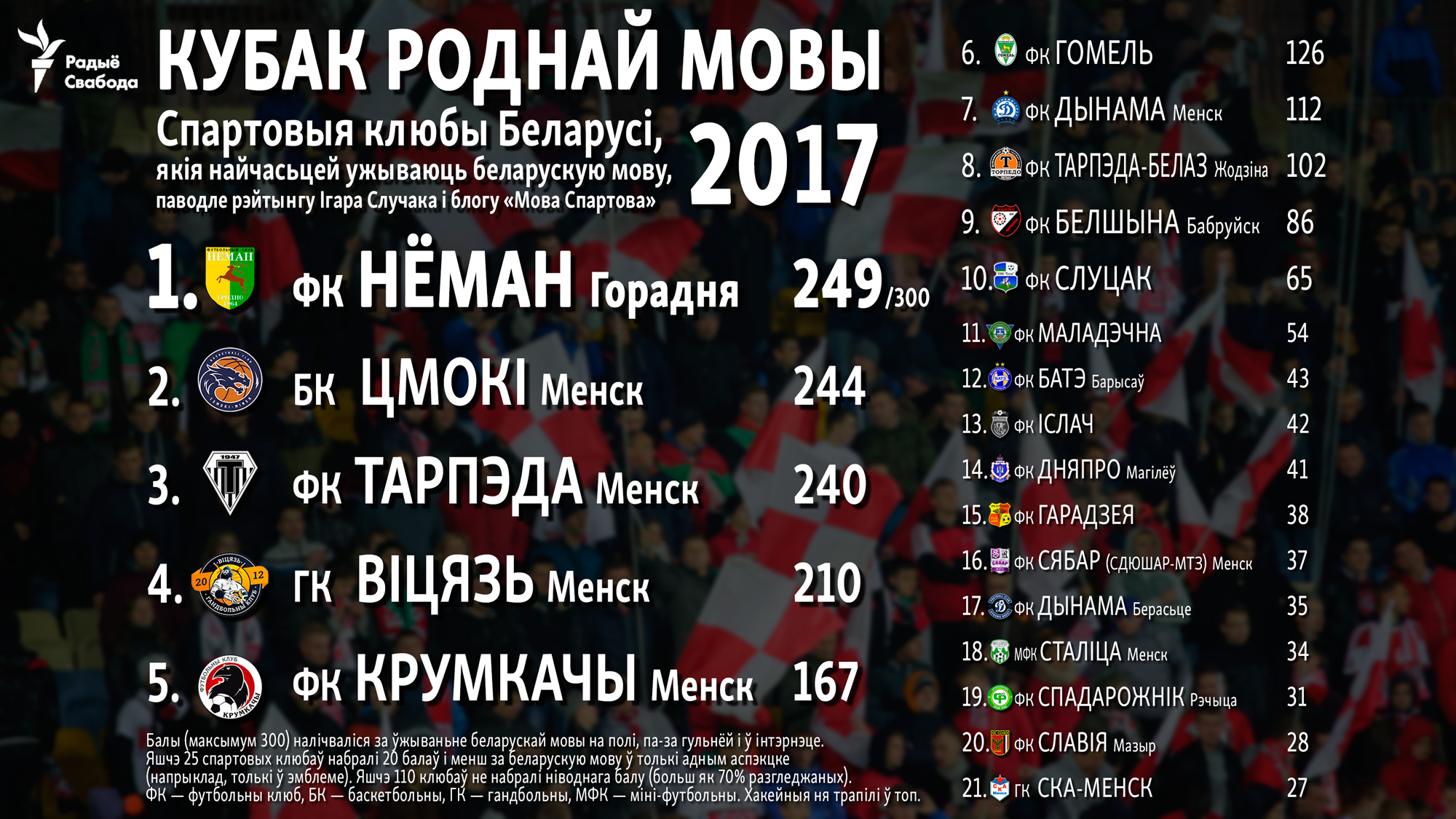 Што праўда, трэнд ідзе ў асноўным па футболе, а акрамя футбольных радуюць хіба гандбольны клюб „Віцязь“, які ў мінулым рэйтынгу не набраў ніводнага балу, а ў гэтым годзе на чацьвёртым месцы, баскетбольныя „Цмокі“, міні-футбольная „Сталіца“, у нейкім выглядзе хакейнае „Дынама“. Хакей, на жаль, самая небеларускамоўная галіна, хоць кажуць, нібы гэта самы нацыянальны від спорту».
