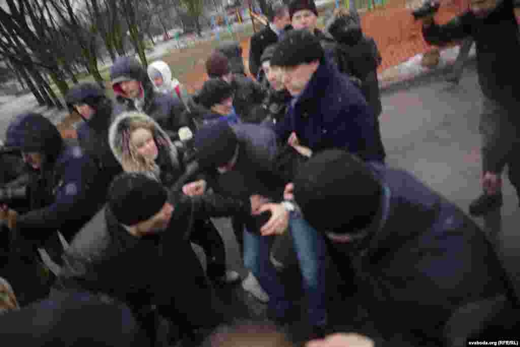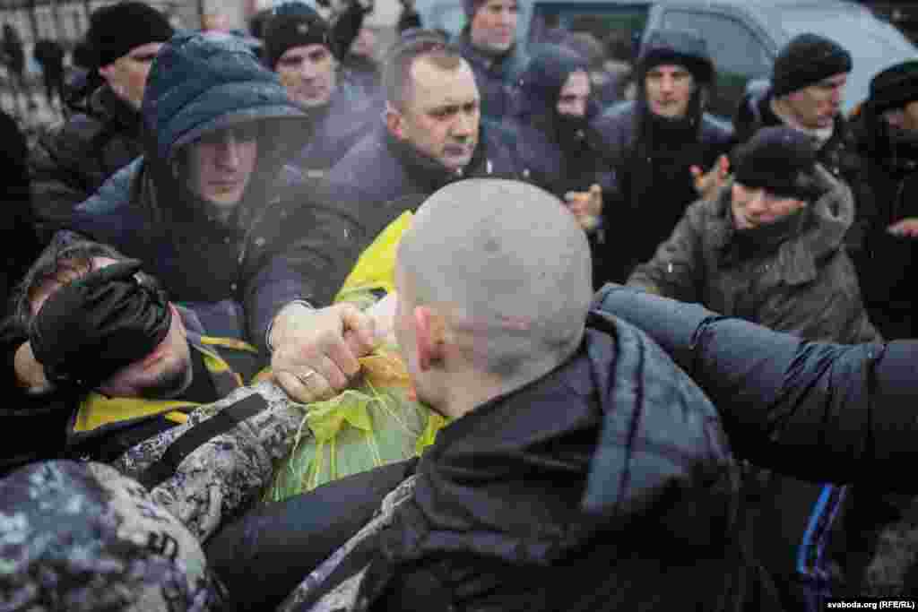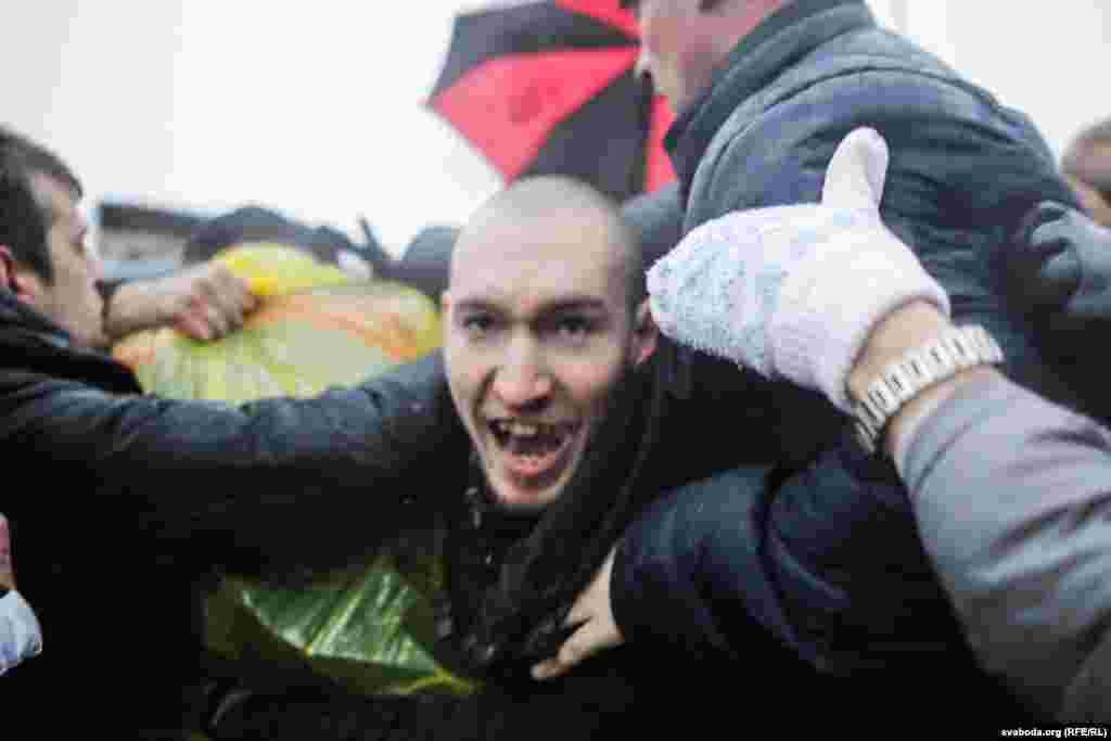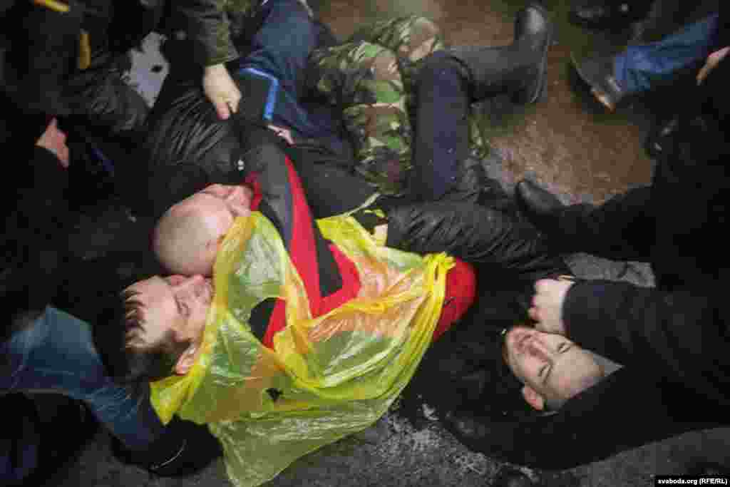 Сяргей Пальчэўскі прыкуў сябе да грузавіка. Зьміцер Дашкевіч узьлез да дах трактара.
