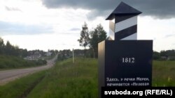 «В 1812 г. войска императора французов НАПОЛЕОНА перешли здесь границу старой России, 2 августа наступая победоносно на Москву, 6 ноября отступая после тяжкого поражения. Сооружение 1912 г. Краснинского земства».