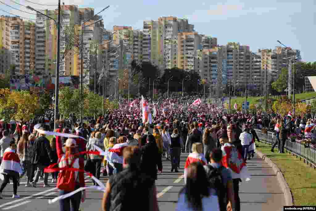 І ўсё ж дэманстрантам удалося сабрацца каля стэлы. Па праспэкце Пераможцаў крочаць ужо дзясяткі тысяч