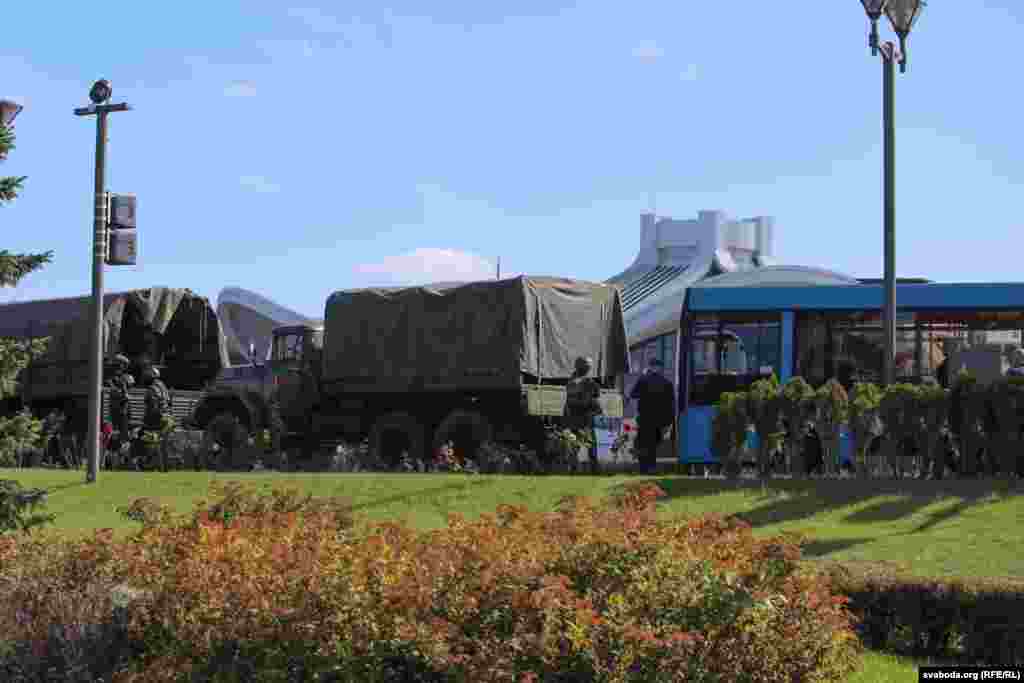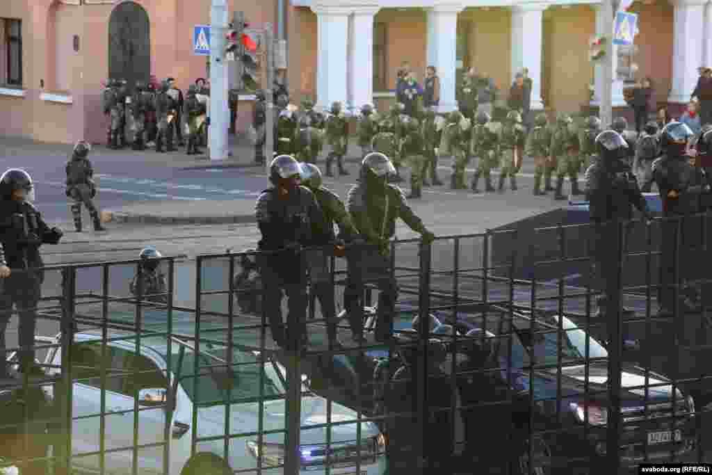 Кастрычніцкую плошчу па ўсім пэрымэтры абнесьлі мэталічнай агароджай, за якой групамі стаяць дзясяткі экіпаваных байцоў унутраных войскаў з аўтаматамі