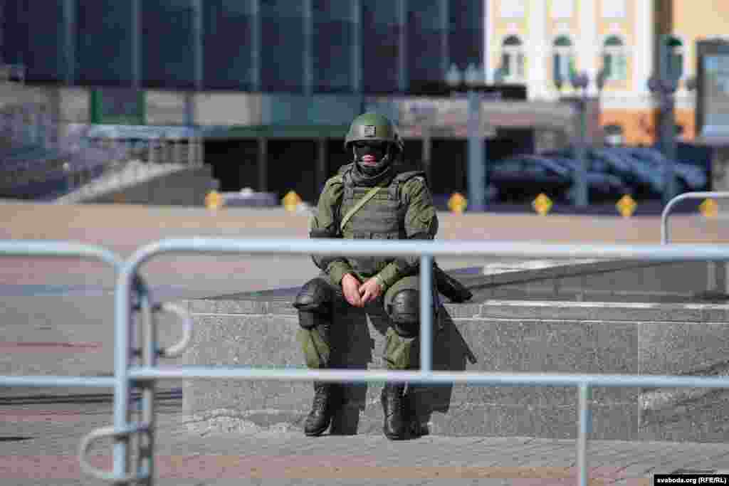 Задоўга да пачатку маршу ўзброеныя сілавікі і спэцтэхніка атачылі галоўныя плошчы і стратэгічныя аб’екты. Салдаты каля манумэнту на плошчы Перамогі