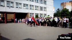 Вучань менскай школы № 180 выклаў у сеціве відэа, як падчас апошняга званка ўрачыста пранесьлі дзяржаўны сьцяг Беларусі дагары нагамі.
