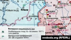 Мапа пра падзеі 1917 году ў Беларусі і на сумежных тэрыторыях. Усталяваньне савецкай улады паўсюль пазначана чырвонымі сьцяжкамі, што пярэчаньняў не выклікае. А беларускі нацыянальны рух?.. Вачам ня веру: бела-зялёна-белымі. Пад гэтымі сымбалямі ў атлясе фігуруюць Усебеларускі зьезд, які адбыўся 16–18 сьнежня 1917 г. у Менску, а таксама Беларуская канфэрэнцыя 25–28 студзеня 1918 году ў Вільні.