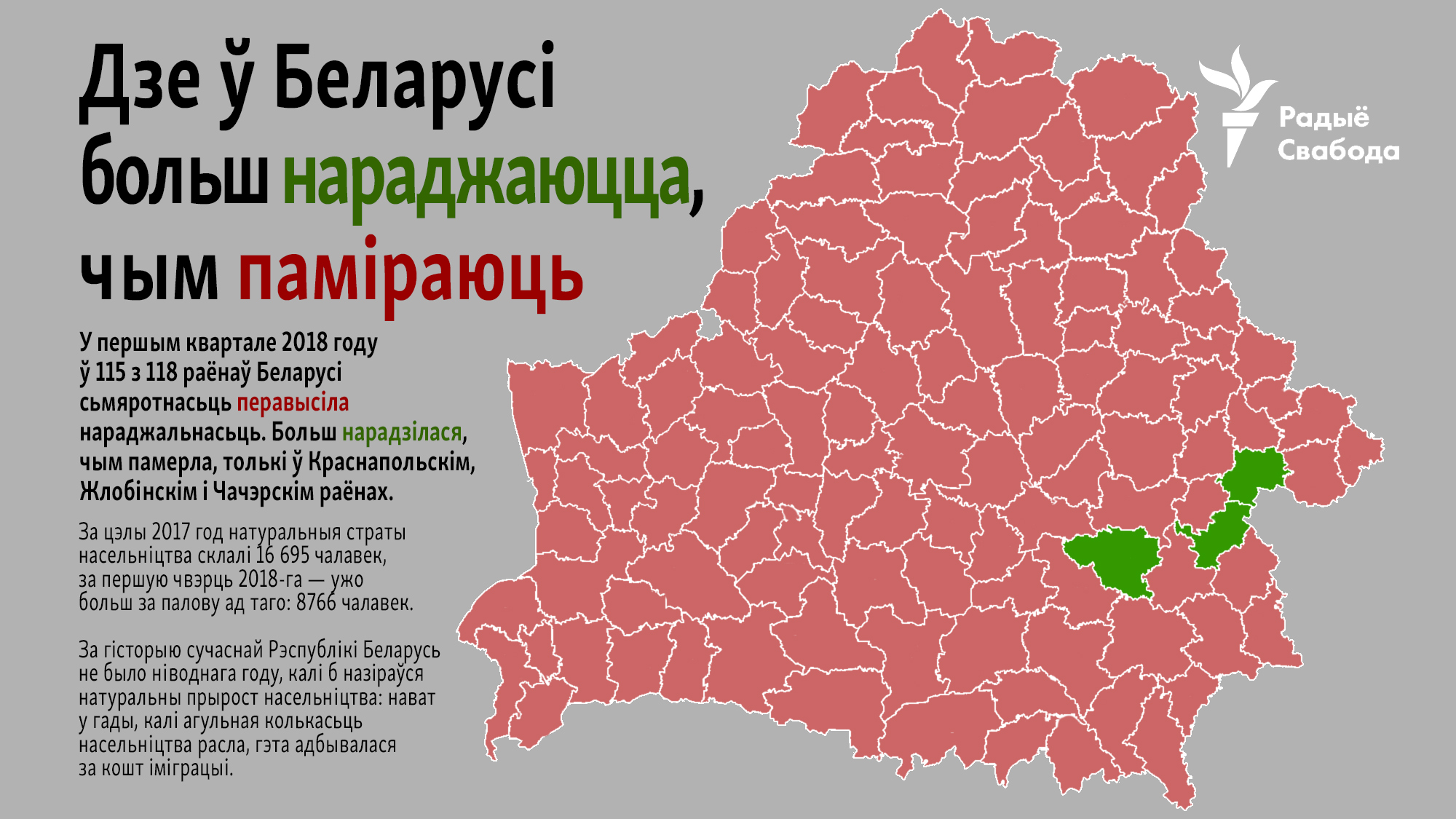 Тэмпы натуральных стратаў насельніцтва зноў вырасьлі: за цэлы 2017 год яны склалі 16 695 чалавек, за першую чвэрць 2018-га — ужо больш за палову ад таго, 8766 чалавек. За гісторыю сучаснай Рэспублікі Беларусь не было ніводнага году, калі б назіраўся натуральны прырост насельніцтва: нават у гады, калі агульная колькасьць насельніцтва расла — гэта адбывалася за кошт іміграцыі.