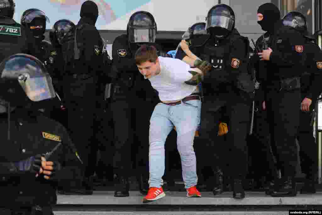 Belarus - Law enforcement officers detain a protester during a rally against police brutality following protests to reject the presidential election results in Minsk, 13sep2020