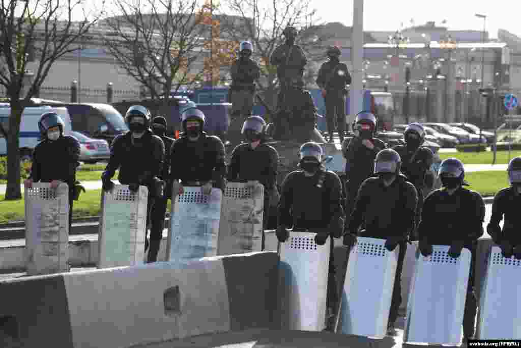 Belarus - Law enforcement officers block a road for opposition supporters during a rally against police brutality following protests to reject the presidential election results in Minsk, 13sep2020