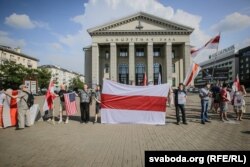Два дзясяткі чалавек прыйшлі на ўрачыстую акцыю, якая пачалася 27 ліпеня а 17-й гадзіне на менскай плошчы Якуба Коласа, ля будынку філярмоніі. Зьміцер Дашкевіч прыехаў на ровары з дачкою Марай. Сябры БНФ і Маладога Фронту разгарнулі вялікі бел-чырвона-белы сьцяг памерам два на тры мэтры і некалькі меншых сьцягоў. Адзін удзельнік прыйшоў з амэрыканскім сьцягам.