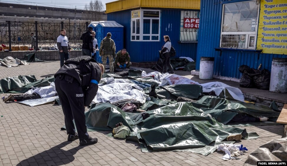Пасьля адступленьня расейскіх войскаў украінскія ўлады і журналісты знайшлі ў горадзе Буча сотні мірных жыхароў, забітых стрэламі, некаторых — са зьвязанымі рукамі. Іх целы былі выкінутыя ў завулкі або падвалы. У суседнім Ірпяні ўлады выявілі дзясяткі сьвежавыкапаных магілаў, дзе былі пахаваныя целы мясцовых жыхароў, многія з агнястрэльнымі раненьнямі.