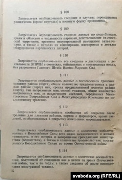 «Забараняецца публікаваць абагульненыя зьвесткі і высновы адносна апэрацый замежных войскаў, якія бралі ўдзел у Другой усясьветнай вайне, за выключэньнем апублікаваных у адкрытым замежным друку».